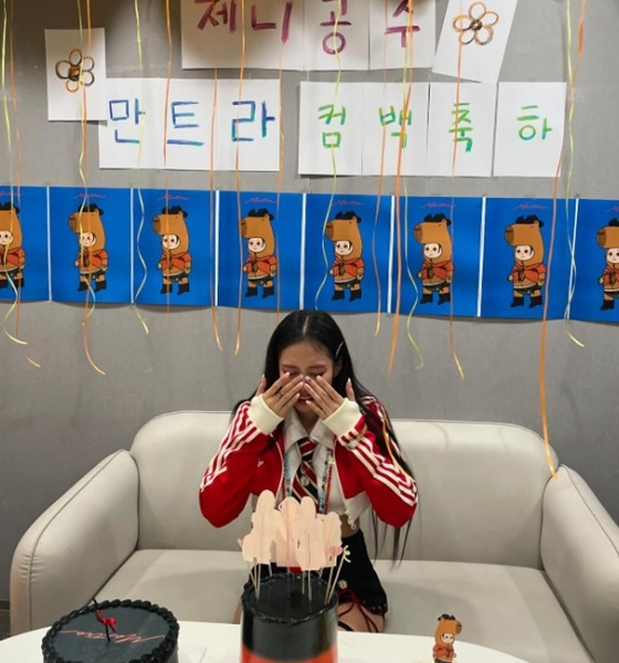 함께 공개된 사진 속에는 '엠카운트다운' 무대 의상을 입은 채 볼 하트로 러블리한 매력을 자아냈다. 특히 '제니 공주 만트라 컴백 축하'라는 문구가 적힌 이벤트에 제니는 얼굴을 가린 채 눈물을 보여 눈길을 끌었다.