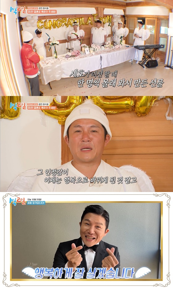 특히 조세호 결혼식 당일 방송된 KBS 2TV '1박 2일 시즌4'에선 멤버들로부터 깜짝 이벤트를 선사받는 조세호의 모습이 그려져 훈훈함을 안겼다. 제작진과 김종민, 문세윤, 이준, 딘딘, 유선호가 조세호 모르게 밤새 이벤트를 준비한 것.