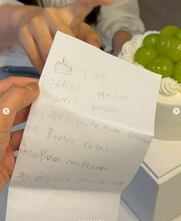 박지윤은 아들이 한국어, 영어, 독일어, 라틴어, 이탈리아어, 프랑스어로 '행복한 생일'이란 단어를 적어 누나에게 선물한 편지도 공개하며 화기애애한 시간을 보냈음을 알렸다.