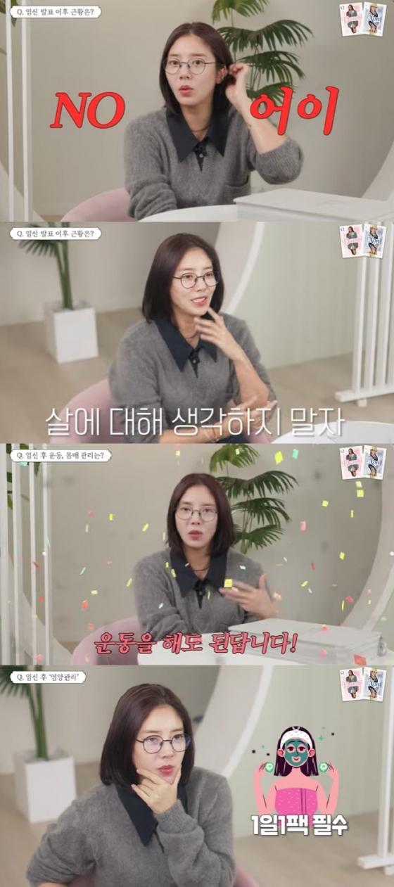 임신 발표 이후 근황에 대해서는 "지금도 초기지만, 제가 노산이니까 초기 때 아예 움직이지 말라고 하셔서 3개월 동안 아무것도 안 했다. 산책도 안 했다"며 "제가 어제 처음으로 몸무게를 쟀는데 상상초월이었다. 출산한 지인들에게 이 몸무게가 맞는지 물어봤다. '네 살이 아니다'라고 하는데 제 살인 것 같다. 놀랐지만 살에 대해서는 생각하지 않으려고 한다"고 밝혔다.