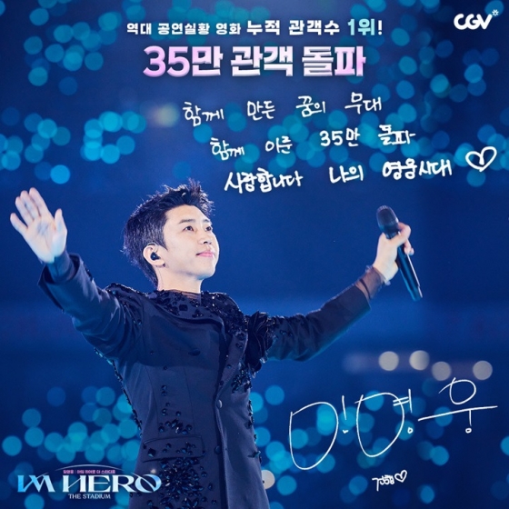 지난 8월 개봉한 '임영웅│아임 히어로 더 스타디움'은 10만 '영웅시대'와 함께 상암벌을 정복한 임영웅의 2024년 5월 서울월드컵경기장 공연 실황과 비하인드를 담은 스타디움 입성기를 담은 공연 실황 영화. 지난 22일 오후 2시 기준 누적 관객 수 35만 38명을 돌파했다.