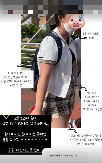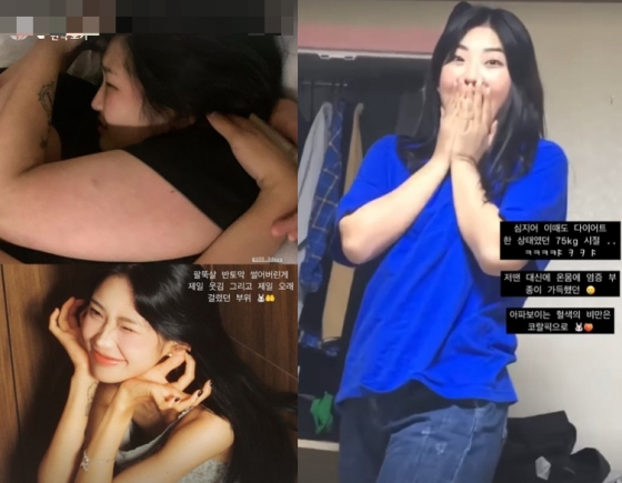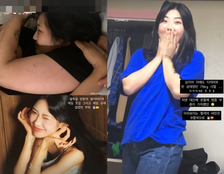 사진을 통해 최준희는 과거 뚱뚱했던 모습을 적나라하게 보여주고 있다. 최준희는 "팔뚝살 반토막 썰어버린게 제일 웃김. 그리고 제일 오래 걸렸던 부위"라며 "심지어 이때도 다이어트한 상태였던 75kg 시절. 저땐 대신에 온몸에 염증 부종이 가득했던"이라고 회상했다.