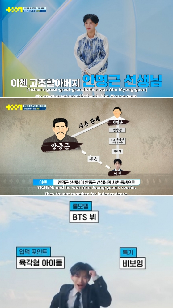 JTBC 아이돌 오디션 프로그램 '프로젝트 7'에 안중근 의사의 후손으로 알려진 중국 출신 연습생 이첸이 개인 프로필 소개 영상에서 뷔를 롤모델로 꼽았다.