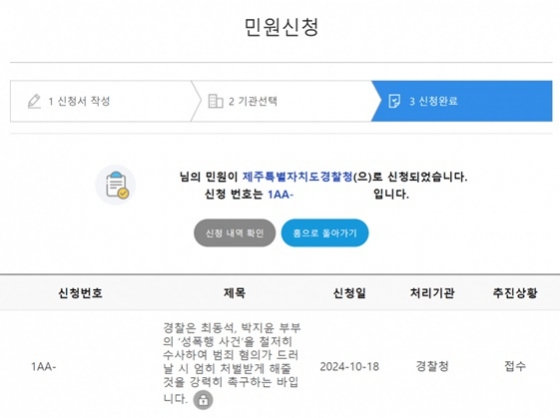 제주특별자치도경찰청 여성청소년과는 28일 A씨의 민원에 "귀하의 민원 내용에 대하여 민원 접수 직후 사건을 접수 및 진행할 담당자를 배정했다"라며 "귀하께서 요청해주신 자료를 토대로 신속·공정하게 수사하도록 하겠다"라고 답변했다.