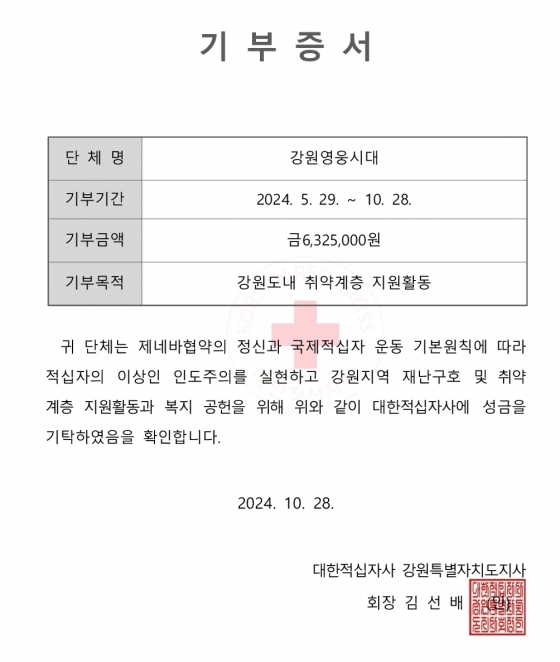 강원영웅시대는 대한적십자사 강원특별자치도지사와 함께 하반기 조성될 기금으로 혹한기 겨울 이불을 증정할 계획이다.