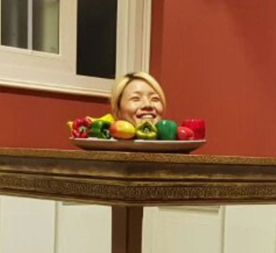 안영미는 30일 자신의 SNS에 '...'이라는 문구와 함께 파프리카 등 야채가 담긴 접시 위에 자신의 얼굴을 내민 사진을 게재했다.