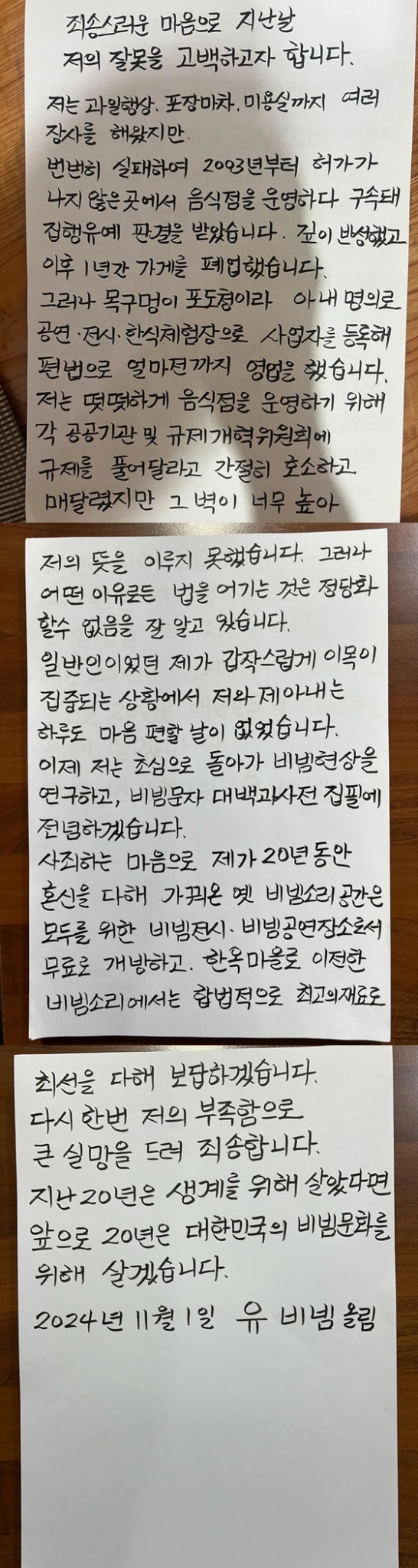 죄송스러운 마음으로 지난날 저의 잘못을 고백하고자 합니다. 저는 과일 행상, 포장마차, 미용실까지 여러 장사를 해왔지만, 번번이 실패하여 2003년부터 허가가 나지 않은 곳에서 음식점을 운영하다 구속돼 집행유예 판결을 받았습니다. 깊이 반성했고, 이후 1년간 가게를 폐업했습니다. 그러나 목구멍이 포도청이라 아내 명의로 공연전시한식체험장 사업자로 등록해 편법으로 얼마 전까지 영업을 했습니다. 저는 떳떳하게 음식점을 운영하기 위해 각 공공기관 및 규제개혁위원회에 규제를 풀어 달라고 간절히 호소하고 매달렸지만 그 벽이 너무 높아 저의 뜻을 이루지 못했습니다. 그러나 어떤 이유로든 법을 어기는 것은 정당화할 수 없음을 잘 알고 있습니다. 일반인이었던 제가 갑작스럽게 이목이 집중되는 상황에서 저와 제 아내는 하루도 마음 편할 날이 없었습니다. 이제 저는 초심으로 돌아가 비빔현상을 연구하고, 비빔문자 대백과사전 집필에 전념하겠습니다. 사죄하는 마음으로 제가 20년 동안 혼신을 다해 가꿔온 옛 비빔소리 공간은 모두를 위한 비빔전시, 비빔공연 장소로서 무료로 개방하고, 한옥마을로 이전한 비빔소리에서는 합법적으로 최고의 재료로 최선을 다해 보답하겠습니다. 다시 한번 저의 부족함으로 큰 실망을 드려 죄송합니다. 지난 20년은 생계를 위해 살았다면, 앞으로 20년은 대한민국의 비빔문화를 위해 살겠습니다.