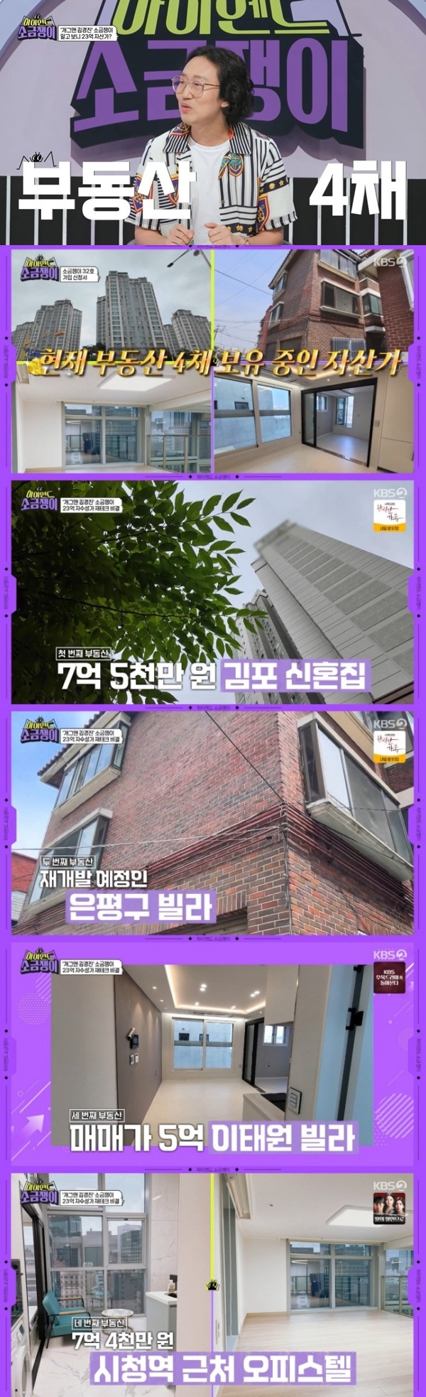 또한 그는 "분양가 3억 2000만 원으로 강서구 오피스텔을 매수한 뒤 2021년 상승기를 만나 시세 차익 3억 원을 냈다"고 전하는가 하면, "아내 명의로 산 은평구 응암동의 빌라는 1억 6000만 원에 구매했는데 현재 4억까지 올랐다. 이태원 빌라는 5억 원에 매입, 시청역 근처 오피스텔은 7억 4000만 원에 매입했다"고 말해 시청자들을 깜짝 놀라게 만들었다.
