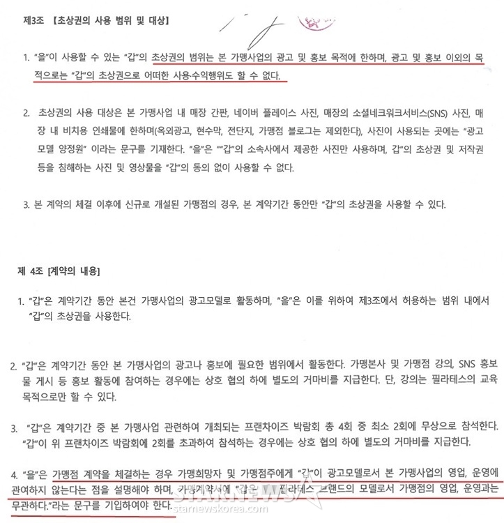 이 계약서에는 '광고 및 홍보 이외의 목적으로는 양정원의 초상권을 어떠한 사용, 수익 행위도 할 수 없다'고 명시돼 있다. 'C사가 가맹점 계약을 체결할 시 양정원이 해당 가맹 사업의 영업, 운영에 관여하지 않는다는 점을 설명해야 한다'는 내용도 계약서에 포함돼 있다.