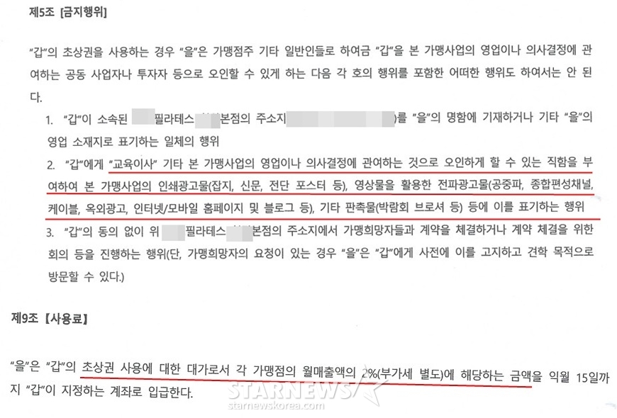 계약서 제 5조에는 가맹사업의 영업이나 의사 결정에 관여하는 것으로 오인하게 할 수 있는 직함을 양정원에게 부여해 인쇄광고물, 영상물을 활용한 전파광고물, 기타 판촉물 등에 표기하는 행위를 '금지 행위'로 규정하고 있다.