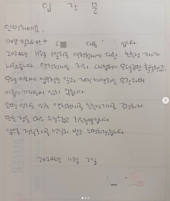 스타뉴스 보도 이후 양정원도 개인 SNS 계정을 통해 직접 입장을 밝혔다. 양정원은 "2021년 초상권 사용 계약 당시, 본사 측에 가맹점주들에게 '광고 모델'임을 명확히 고지해줄 것을 요청한 이후 계약을 진행했다"며 "2년의 계약 기간 동안 박람회 참석, 필라테스 관련 활동 등 홍보 모델로서 성실히 활동했다"고 전했다.