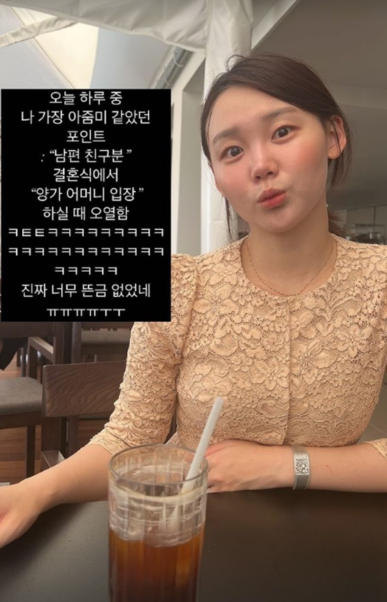 김수민은 "오늘 하루 중 나 가장 아줌마 같았던 포인트"라며 "남편 친구분 결혼식에서 양가 어머니 입장하실 때 오열함. 진짜 너무 뜬금없었네"라고 전했다.