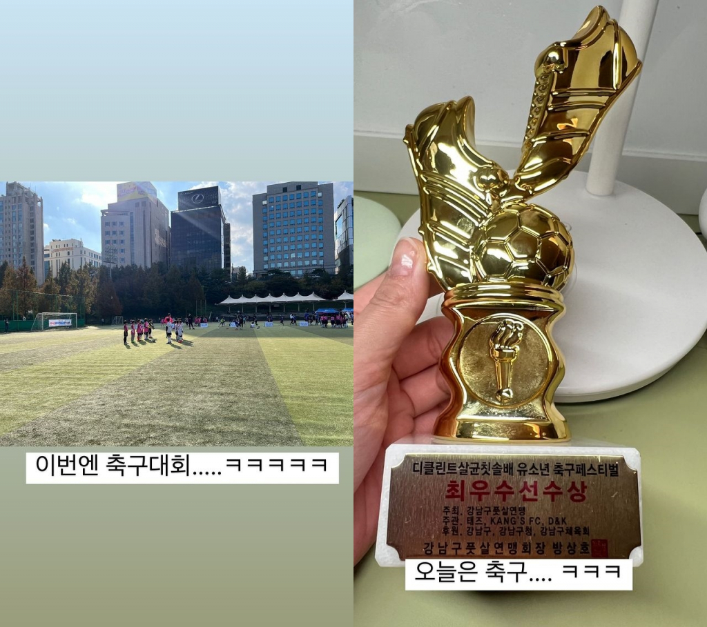 공개된 사진 속에는 한 축구 대회에 참가한 듯한 이민정의 아들 준후 군과 이를 관람하기 위해 경기장에 찾은 이민정의 모습이 담겼다. 이민정은 아들이 참가한 유소년 축구페스티벌의 트로피를 공개했다. 이민정의 아들은 최우수선수상을 받으며 축구에도 두각을 나타낸 것으로 보인다.