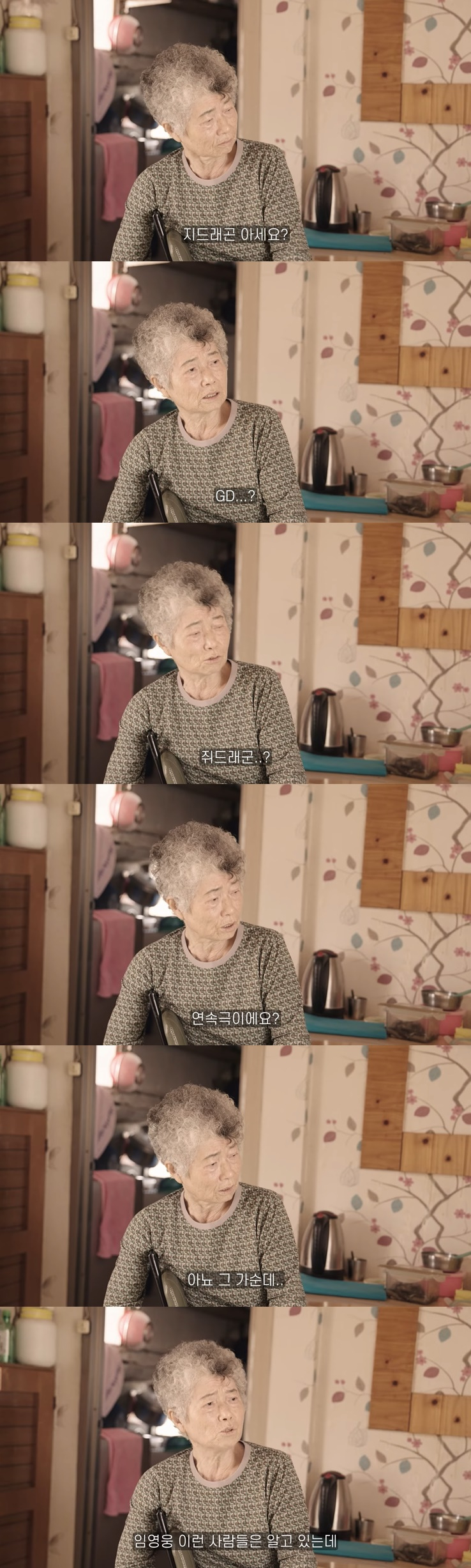 이에 김민준은 "혹시 지드래곤 아시냐"라고 자신의 처남인 빅뱅 지드래곤에 대해 물었고 할머니는 "쥐드래군?"이라며 "연속극이냐. 모른다"라고 답했다.