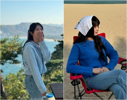 공개 된 사진 속 엄현경은 파란색 니트를 입고 의자에 앉아서 바닷가를 바라보고 있다. 또 다른 사진은 바다를 바라보며 참을 수 없이 행복한 웃음을 짓고 있다.
