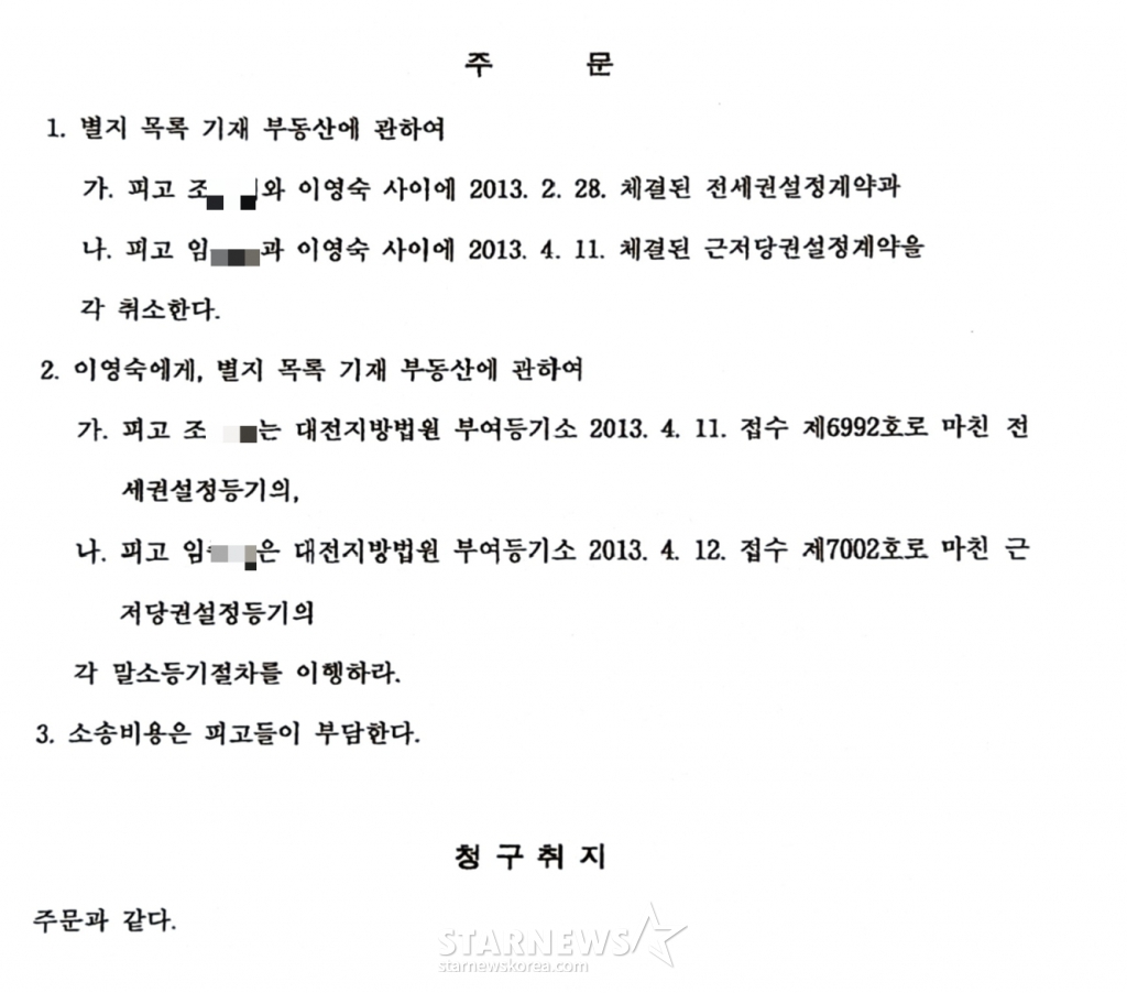 A씨의 말대로, 2013년 사해행위취소 판결문에는 "조 씨(이영숙 딸)와 이영숙 사이 전세권설정계약과 임 씨와 이영숙 사이 근저당권설정계약을 취소한다"라며 "이영숙은 별지 목록 기제 부동산에 관해 조 씨의 전세권설정 등기와 임 씨의 근저당권 설정계약등기의 각 말소 절차를 이행하라"고 주문했다.