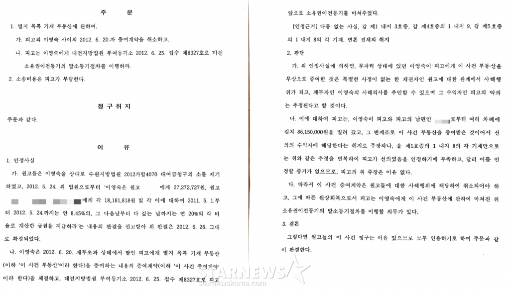 2012년 사해행위취소 판결문에 따르면 이영숙은 대여금청구소송 이후인 그해 6월 토지 일부를 딸에게 증여했다. 이와 관련 재판부는 "무자력 상태에 있던 이영숙이 피고(이영숙의 딸)에게 이 사건 부동산을 무상으로 증여한 건 특별한 사정이 없는 채권자인 원고에 대한 관계에서 사해행위가 되고 채무자인 이영숙의 사해 의사를 추인할 수 있으며 수익자는 피고의 악의는 추정된다"고 판단했다.