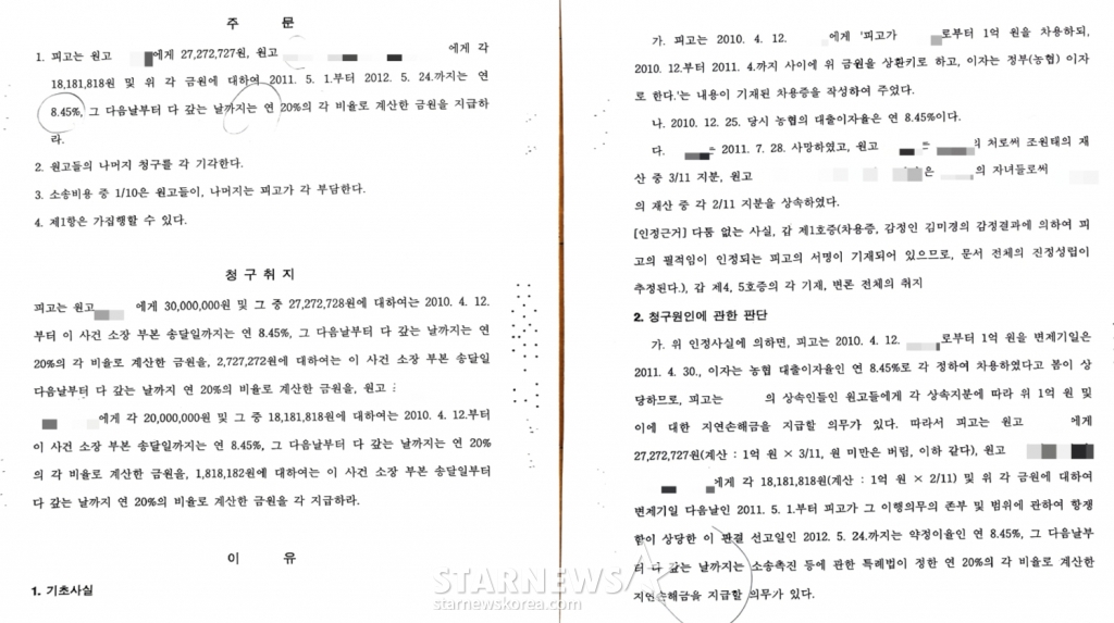 2012년 대여금청구소송 판결문에 따르면 A씨는 이영숙을 상대로 승소했다. 재판부는 "이영숙은 '조 씨(A씨 부친)에게 1억 원을 차용하고 2010년 12월부터 2011년 4월까지 위 금액을 상환키로 하고, 이자는 정부(농협) 이자로 한다'는 내용의 차용증을 작성했다"라며 "조 씨는 사망했고, 자녀들에게 각 2/11 지분을 상속했다. 이에 따라 이영숙은 A씨와 그의 가족들에게 1억 원에 대한 지연손해금을 지급할 의무가 있다"라고 봤다.