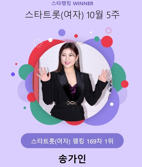 송가인은 지난 10월 31일 오후 3시 1분부터 11월 7일 오후 3시까지 진행된 10월 5주(169차) 스타랭킹 스타트롯 여자 부문 랭킹 부문에서 1위를 기록했다.
