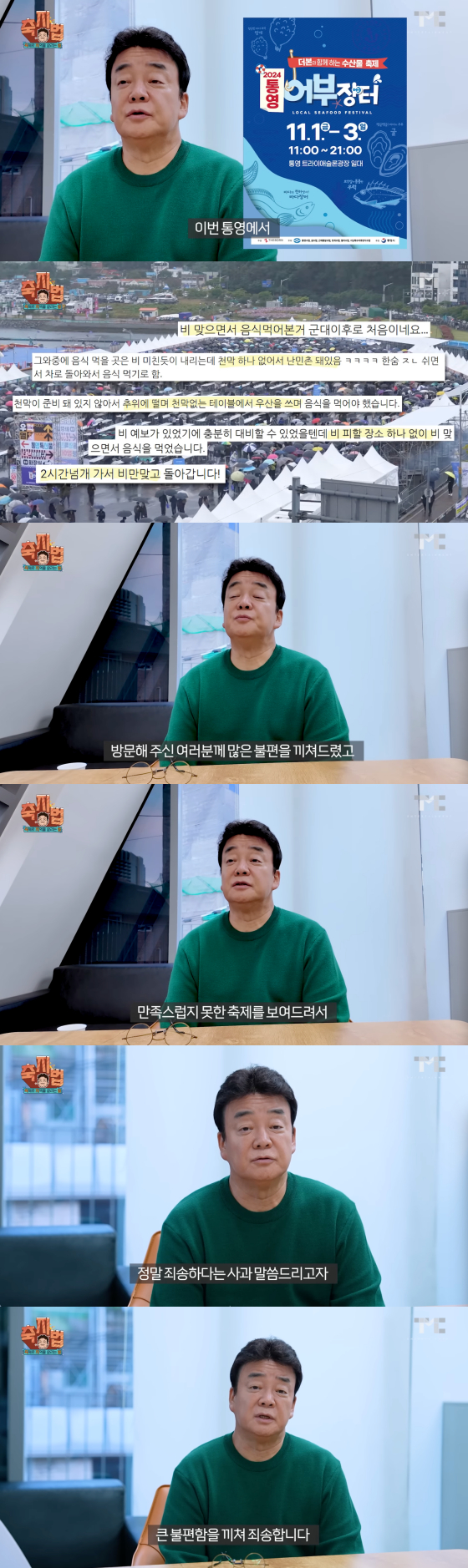 백종원 더본코리아 대표가 통영 '어부장터' 축제를 찾은 방문객들에게 사과했다.