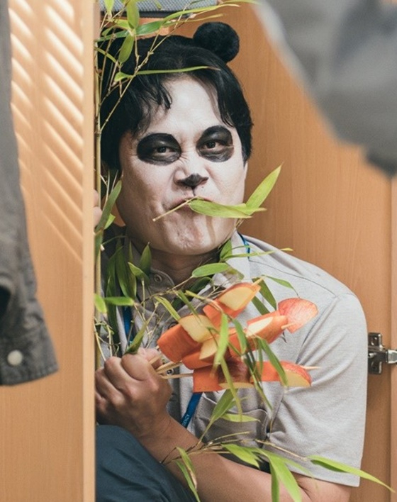 이 가운데 9일 김성균이 '푸바오'로 깜짝 변신한 스틸이 공개돼 이목을 집중시킨다. 극 중 푸바오 분장을 한 구대영이 경찰서 안 여기저기에서 범상치 않은 몰골로 출몰하는 상황. 구대영은 얼굴은 새하얗게, 눈 주변은 새까맣게 칠한 뒤 판다 귀를 형상화한 머리띠까지 장착, 완벽한 판다의 면모를 뽐낸다. 더욱이 캐비닛 안에 숨어 있던 구대영은 대나무 잎을 입에 문 채 사과 꼬치를 끌어안고, 밖으로 나와서는 대환장 행동을 선사해 모두의 경악을 이끈다. 과연 안방극장을 웃음바다로 만들 구대영의 '대환장 모먼트'는 어떤 이유로 탄생하게 된 것인지, 푸바오 변신과 관련한 속사정은 무엇인지 궁금증이 치솟는다.