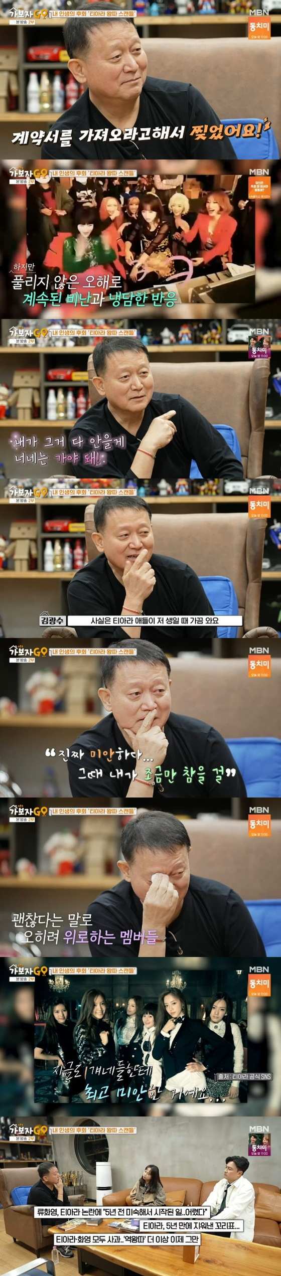김광수는 과거 K팝 시장을 발칵 뒤집었던 티아라 왕따 사건과 김종국 폭행설, 유명 연예인과의 스캔들 등을 언급했다. 지난 9일 MBN 예능 '가보자GO'에 출연한 김광수는 티아라 왕따 사건에 대해 "내가 나락으로 떨어졌던 일이다. 티아라 멤버 사이 불화를 알게 돼 화영과 효영 자매의 계약을 해지했는데 그 일로 왕따설이 났다. 다른 멤버들의 부모님이 찾아와서 진실을 밝히자고 했지만 '그럼 그 친구들의 인생은 어떻게 되겠나?' 싶어서 하지 못했다"라며 당시 심정을 고백했다.