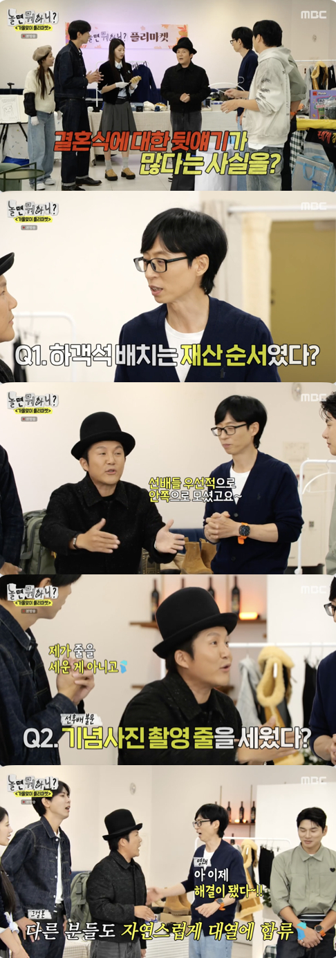이어 조세호는 "결혼식에서 왜 조세호와 사진을 찍으려고 줄을 서야 했는지 의아했다"라는 유재석의 말에 "친인척들 사진 요청으로 생긴 줄이었다"라며 의도한 것이 아니라고 했다. 또한 주우재가 자신의 자리가 왜 문 앞이었냐고 묻자 조세호는 "입장하는 곳에서 친한 분들의 축하를 받고 싶었다"고 설명했다.