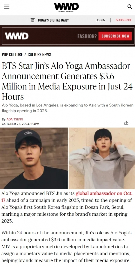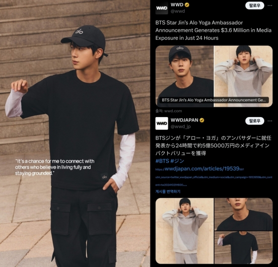 방탄소년단(BTS) 진이 미국 럭셔리 액티브 웨어 브랜드 '알로 요가'(Alo Yoga) 글로벌 앰버서더로서 강력한 브랜드 파워를 자랑했다.