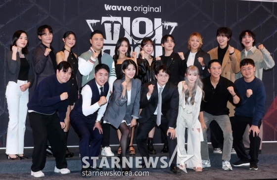 12일 오후 서울 성동구 메가박스 성수에서 진행된 웨이브 오리지널 '피의 게임 시즌3' 제작발표회에서 주역들이 포즈를 취하고 있다.