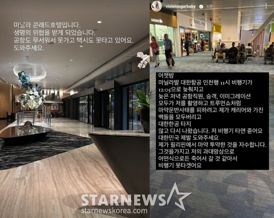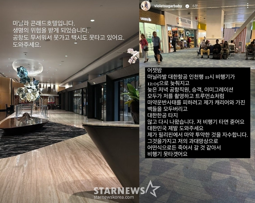 해당 글에는 "어젯밤 마닐라발 대한항공 인천행 11시 비행기가 12시 5분으로 늦춰졌다"라며 "늦은 저녁 공항 직원, 승객, 이미그레이션 모두가 저를 촬영하고 트루먼 쇼처럼 마약 운반 사태를 피하려고 내가 가진 캐리어와 가방을 모두 버리고 대한항공을 타지 않고 나왔다"라고 남겨져 있다.