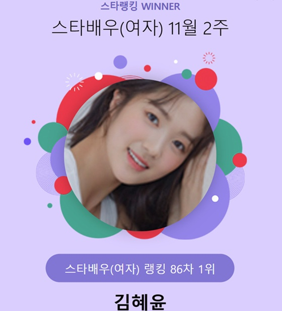 김혜윤은 7일 오후 3시 1분부터 14일 오후 3시까지 진행된 11월 2주(86차) 스타랭킹 스타배우 여자 랭킹 투표에서 2만 6607표로 1위를 차지했다.