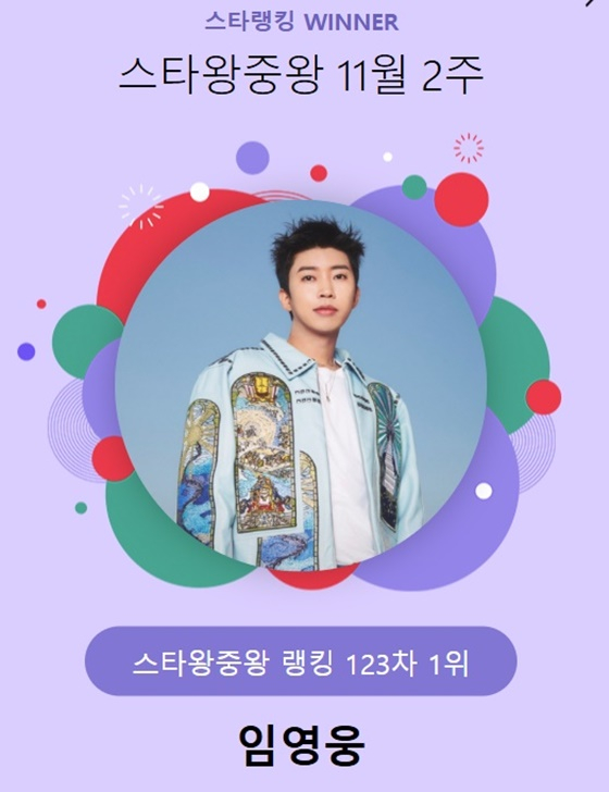 임영웅은 지난 8일 오후 3시 1분부터 15일 오후 3시까지 진행된 11월 2주(123차) 스타왕중왕 랭킹 투표에서 15만 3838표를 차지하며 123주 연속 1위를 차지했다.