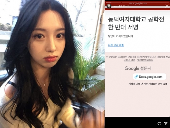 김수정은 16일 자신의 인스타그램 계정에 동덕여대 재학생들이 진행 중인 '남녀공학 전환 반대 서명'에 동참한 내용을 공개하며 "세상에 이해 안 가는 사람들이 너무 많다"고 적었다.