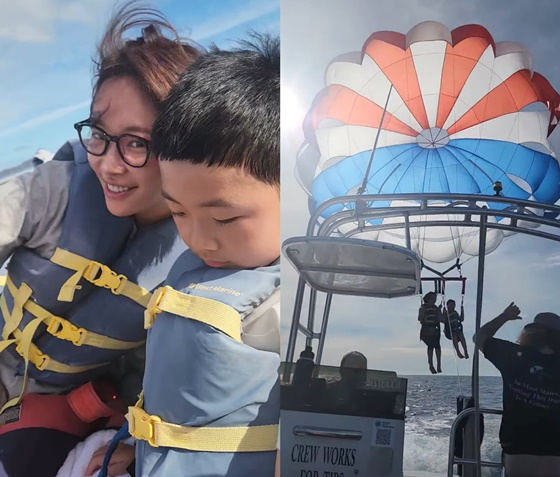 황정음은 아들과 함께 패러세일링에 도전했다. 겁을 먹은 황정음과 달리 그의 아들은 씩씩한 모습으로 해양 스포츠를 즐기고 있다.