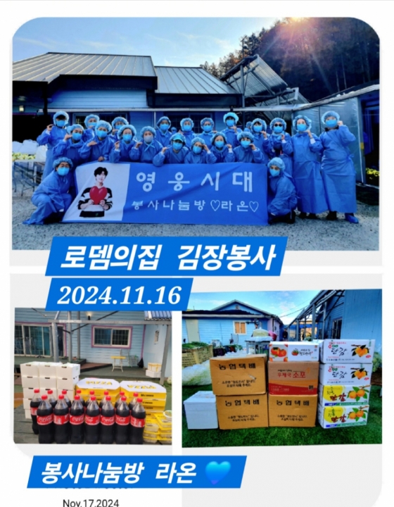 임영웅 팬클럽 영웅시대 봉사나눔방 '라온'은 11월 16일 경기 양평 '로뎀의집'에서 41번째 급식 봉사로 김장 봉사를 했다.