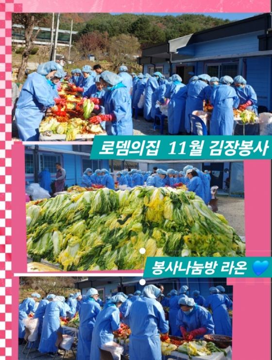 '라온'은 이달에는 '로뎀의집' 원생들을 위해 2500포기 김장 봉사와 함께 점심 급식으로 치킨, 피자, 떡을 제공했다. 또 김장에 들어가는 생새우와 생굴 15kg, 한우 양지 11kg과 단감 6상자, 연시 5상자를 후원했다. 총후원금액은 275만 원이다.