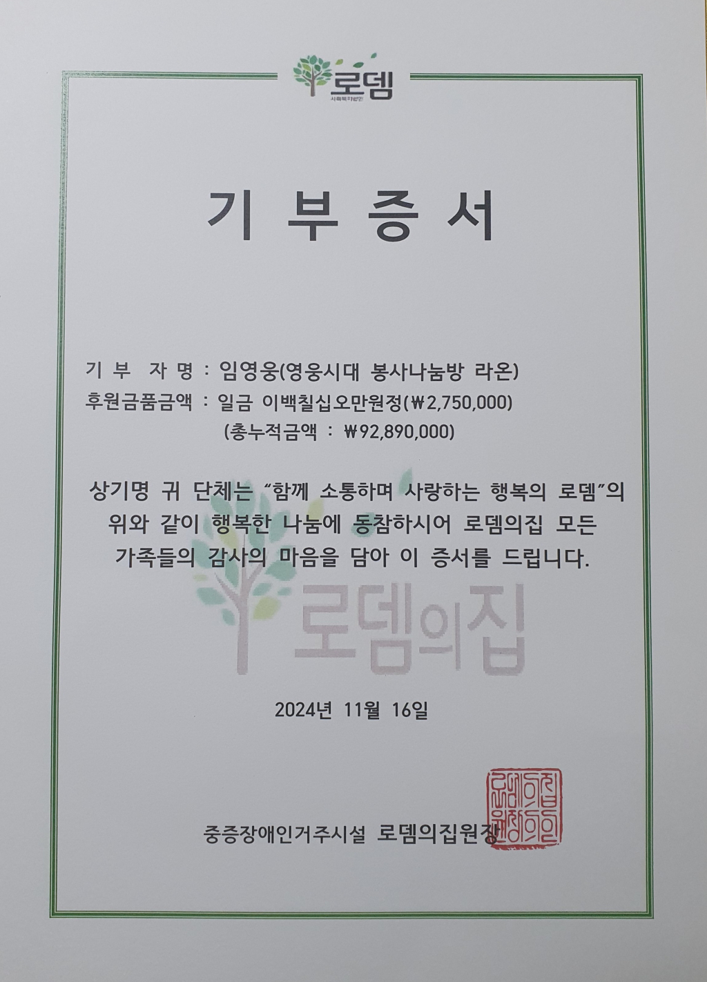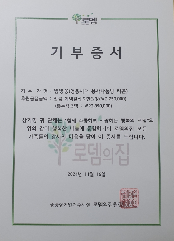'라온'은 3년 5개월 동안 로뎀의집을 포함해 쪽방촌, 용산박스촌, 서울시아동복지협회, '희망을파는사람들'을 통해 급식 봉사와 어려운 청소년 자립을 위한 후원금 기부, 지난해부터 서울대어린이병원을 통해 중증 어린이 환자를 위한 후원도 하고 있다. 총후원금액은 1억 3433만 원에 이른다.