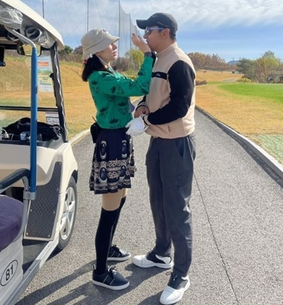 공개한 사진엔 골프 라운딩 중 주진모, 민혜연의 다정한 투샷이 담겼다. 민혜연은 11세 연상의 주진모의 입술을 만지고 있는 모습으로, 여전히 신혼 같은 분위기를 연출했다.