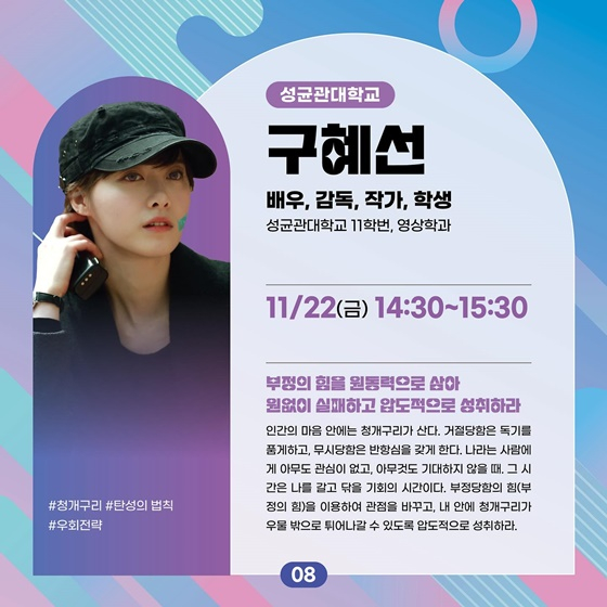 이와 함께 게재한 사진엔 오는 22일 오후 2시 30분부터 1시간 동안 진행되는 구혜선의 강연 설명이 담겼다. 포스터엔 구혜선의 사진과 '청개구리, 탄성의 법칙, 우회전략'이라는 키워드가 표기됐다. 또한 '부정의 힘을 원동력으로 삼아 원 없이 실패하고 압도적으로 성취하라. 인간의 마음 안에는 청개구리가 산다. 거절당함은 독기를 품게 하고 무시당함은 반항심을 갖게 한다. 나라는 사람에게 아무도 관심이 없고, 아무것도 기대하지 않을 때. 그 시간은 나를 갈고닦을 기회의 시간이다. 부정당함의 힘(부정의 힘)을 이용하여 관점을 바꾸고, 내 안에 청개구리가 우물 밖으로 튀어나갈 수 있도록 압도적으로 성취하라'라는 구혜선만의 철학도 엿볼 수 있었다.