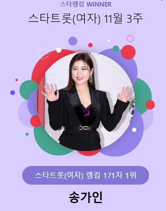 송가인은 지난 14일 오후 3시 1분부터 21일 오후 3시까지 진행된 11월 3주(171차) 스타랭킹 스타트롯 여자 부문 랭킹 부문에서 1위를 차지했다.