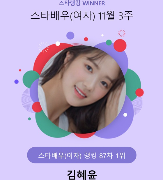 김혜윤은 14일 오후 3시 1분부터 21일 오후 3시까지 진행된 11월 3주(87차) 스타랭킹 스타배우 여자 랭킹 투표에서 2만 5291표로 1위를 차지했다.