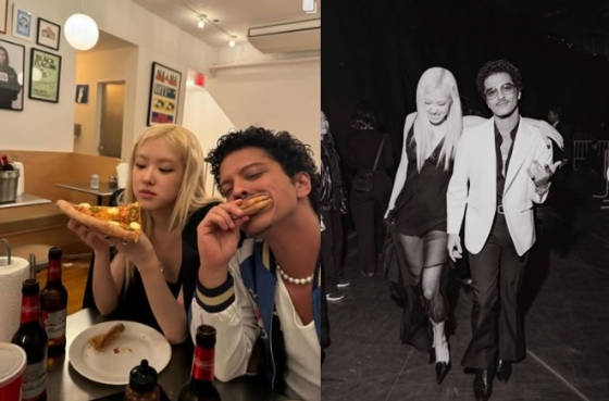 사진에는 지난 23일 성황리에 마무리된 '2024 마마 어워즈' 이후 오사카의 한 피자 가게를 방문한 로제와 브루노 마스의 모습이 담겼다.
