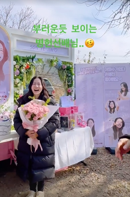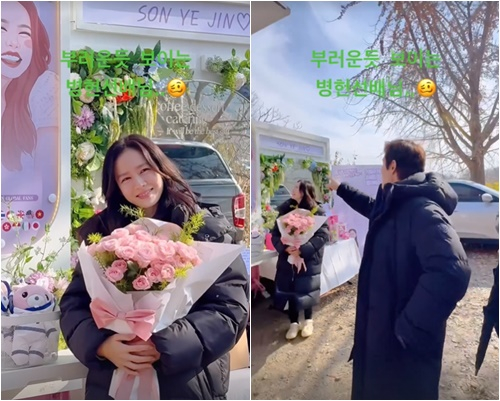 공개 된 사진 속 손예진은 예쁘게 장식된 커피차 앞에서 큰 꽃다발을 들고 포즈를 취하고 있다. 감사의 마음을 전하기 위해 포즈를 취하는 손예진의 모습이 사랑스럽다.
