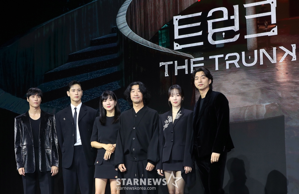 김규태 감독(왼쪽 네번재), 배우 김동원, 조이건, 정윤하, 서현진, 공유가 26일 오전 서울 강남구 역삼동 라움아트센터에서 진행된 넷플릭스 시리즈 '트렁크' 제작발표회에 참석해 포즈를 취하고 있다.