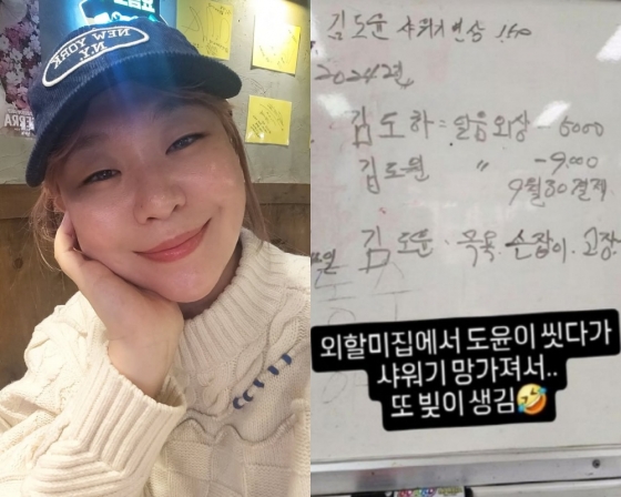이에 대해 정주리는 "외할머니 집에서 도윤이 씻다가 샤워기 망가져서 또 빚이 생김"이라고 설명해 웃음을 안겼다.