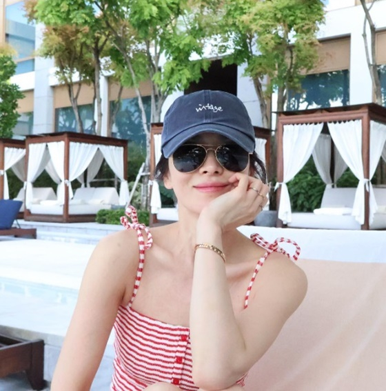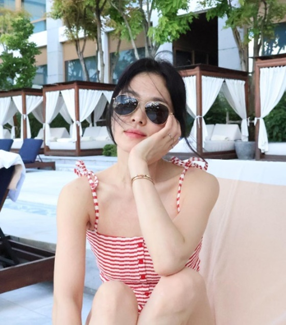 공개된 사진 속 송혜교는 야외 수영장에서 빨간 줄무늬 수영복을 입고 백옥 같은 피부를 자랑했다. 모자와 선글라스에도 가려지지 않은 미모를 자랑했다.