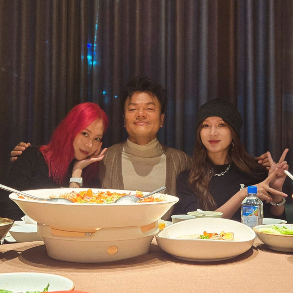 사진 속 박진영은 중국의 한 식당에서 지아, 페이와 나란히 앉아 식사를 즐기고 있는 모습. 세 사람은 어깨동무를 한 채 카메라를 향해 브이 포즈를 취하며 해맑게 웃고 있다.