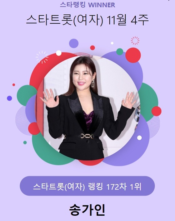 송가인은 지난 21일 오후 3시 1분부터 28일 오후 3시까지 진행된 11월 4주(172차) 스타랭킹 스타트롯 여자 부문 랭킹 부문에서 1위를 차지했다.