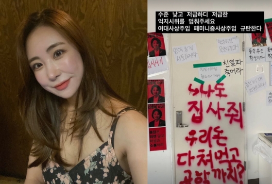 김성은은 29일 자신의 인스타그램에 "수준 낮고 저급하디 저급한 억지시위를 멈춰주세요. 여대 사상 주입, 페미니즘 사상 주입 규탄한다"라는 글과 함께 사진 한 장을 공개했다.