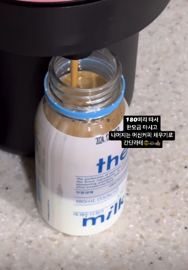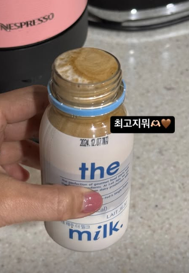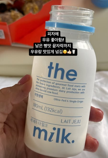 사진에서 피자와 우유를 먹었다고 알린 박지윤은 "피자에 우유 좋아함! 남은 빵맛 끝자락까지 우유랑 맛있게 넘김. 180ml 따서 한모금 마시고 나머지는 머신커피 채우기로 간단 라테. 최고지 뭐"라고 전했다.